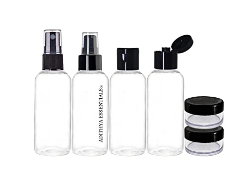 Adithya Essentials Refillable Empty Bottle Multipurpose Cosmetic Toiletries Travel Bottle Kit with 4 Empty Refillable Bottles with Jars(CLEAR-BLACK 50ml)