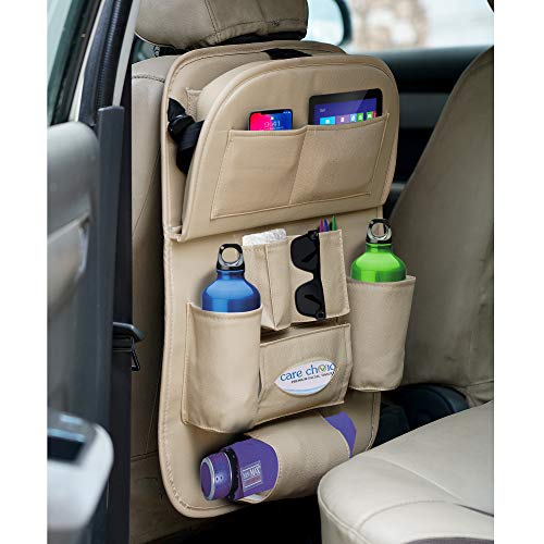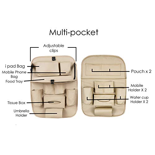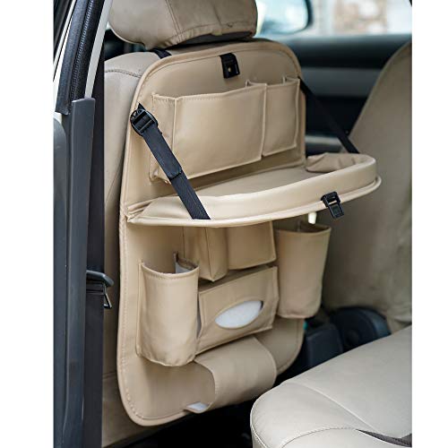 Akhilesh Leather Car Backseat Organizer with Foldable Dining Table Tray Waterproof Back Seat Storage Pockets with Tablet, Mobile, Bottle, Tissue Box and Umbrella Holder (Beige)