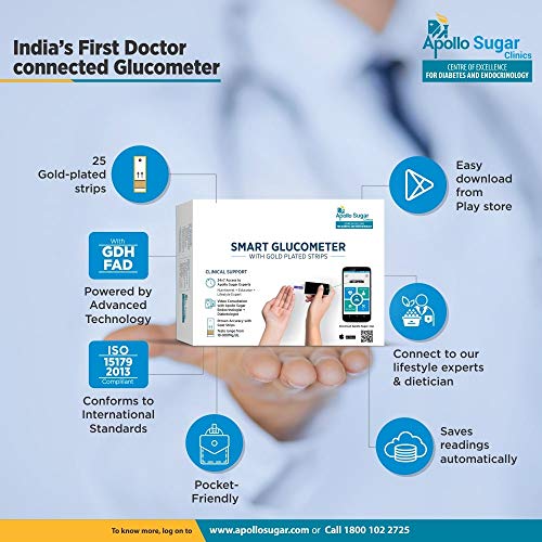 APOLLO SUGAR GLUCOMETER WITH 25 GOLD PLATED STRIPS FREE HEALTH SOCKS is an affordable diabetes care solution with unique offerings. APOLLO SUGAR SMART GLUCOMETER is a state of the art smart digital glucometer that sends blood sugar readings directly to the doctors and family members as soon as one measures them, in real time. It meets the ISO15179:2013 accuracy standard. APOLLO SUGAR SMART GLUCOMETER in conjunction with Apollo Sugar app streamlines diabetes care by aligning patients, caregivers, and medical professionals on a single platform.For more our products range search as APOLLO SUGAR in AMAZON search option