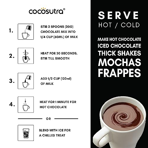 Stir 2 tablespoons (20 g) of Cocosutra SLIM Drinking Chocolate Mix to a splash of milk of choice. Heat for 30 seconds. Stir till smooth. Blend with ice and 160 ml milk for iced chocolate OR heat with 160 milk for a luxurious hot chocolate.