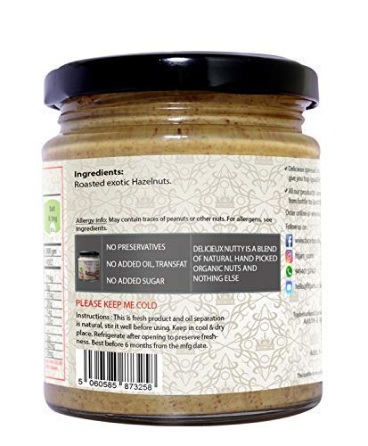 Our Delicieux Hazelnut Butter is ultra-pure, made simply from Stone Ground of HAzelnuts. We roast Hazelnuts until they are light brown and oozes out natural nutty aroma and blend it until get smooth consistency. Our Hazelnut Butter is freshly packed in the glass jar and natural oils will separate to top of the jar which is very natural. Mix well before using the Hazelnut Butter.Each Hazelnut Butter jar is subjected to high level of quality check so you don’t have worry about quality and taste. We specialise in making best Hazelnut Butter around the world and our features include No Added Sugar | No Salt | No Preservatives | Vegan | Palm Oil Free | Peanut Free | Dairy Free | Gluten Free | Lactose-Free. Almond butter is perfect replacement for jam or traditional dairy utter and be used on breakfast on toast ,oatmeal or fruit such as banana or apple.Best is via pre-workout snack with dates stuffed with Hazelnut Butter to get the best pump in the gym.All our jars are freshly packed and usually comes with 6months of storage life | Storage: Room temperature is ideal however we recommend to refrigerate once opened to preserve freshness |Type of Container: Glass Bottle.