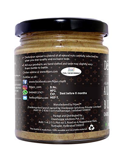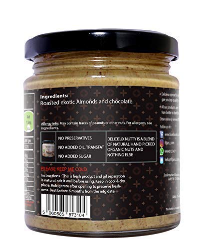 Our Delicieux Almond Butter with Dark Chocolate is Keto Vegan & ultra-pure, made simply from Premium California Almond and added Dark chocolate ( Cocoa,Coconut Oil, Stevia). We roast Almonds until they are light brown and oozes out natural nutty aroma and blend with dark chocolate it until get smooth consistency. Our Almond Butter with Dark Chocolate is freshly packed in the glass jar and natural oils will separate to top of the jar which is very natural. Mix well before using the Almond Butter with Dark Chocolate.Each jar is subjected to high level of quality check so you don’t have worry about quality and taste. We specialise in making best almond butter around the world and our features include No Added Sugar | No Salt | No Preservatives | Vegan | Palm Oil Free | Peanut Free | Dairy Free | Gluten Free | Lactose-Free. Almond butter Darkchocolate is perfect replacement for jam or traditional dairy utter and be used on breakfast on toast ,oatmeal or fruit such as banana or apple.Best is via pre-workout snack with dates stuffed with almond butter with Dark chocolate to get the best pump in the gym.All our jars are freshly packed and usually comes with 6months of storage life | Storage: Room temperature is ideal however we recommend to refrigerate once opened to preserve freshness |Type of Container: Glass Bottle.
