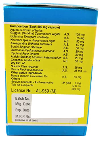 GUGGULU (SUDDHA) COMMIPHORA WIGHTII A.S 100MG GULANCHA TINOSPORA CORDIFOLIA A.S 75MG KHURASANI AJWAIN HYOSCYAMUS NIGER A.S 50 MG ASHWAGANDHA WITHANIA SOMNIFERA A.S 50 MG SUNTHI ZINGIBER OFFICINALE A.S 50 MG JATAMANSI NARDOSTACHYS A.S 20 MG PIPULMUL PIPER LONGUM A.S 20 MG ALACHI (SUDDHA) ACONITUM HETEROPHYLLUM A.S 20MG CHOPCHINI SMILAX CHINA A.S 50MG DRY EXT.oF: NISHINDA VITEX NIRGUNBO A.S 25 MG RASNA PLUCHEA LANCEOLATA A.S 25 MG OTHER ACTIVE INGREDIENTS : BANGA VHASMO CALCINATED TIN A.S 10 MG OTHERS: SODIUM BENZOATE-AS PRESERVATIVE I.P (96) 5MG TALC-AS EXCIPIENTS Q.S.to 500 MG