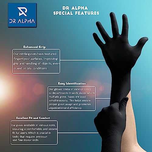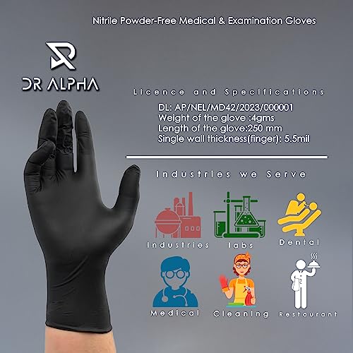 Dr Alpha Nitrile Disposable Examination Gloves | Powder-Free, Latex-Free and Allergic-Free | Superior Hand Protection and Comfort in Medical, Dental, Restaurants, Saloon, Tatoo, Home, Pets and Industrial Settings (Large (100 Gloves), Black)
