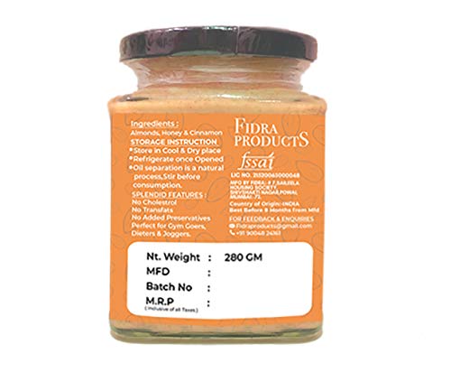 Fidra Products Creamy Almond Butter with Honey & Cinnamon | 25% Protein | Plant-Based Nutrition | 100% Almonds | Zero Additives | Vegan | Dairy Free | 100% Natural (280gm)