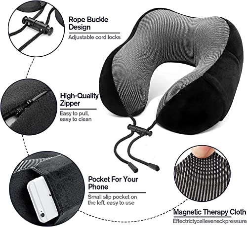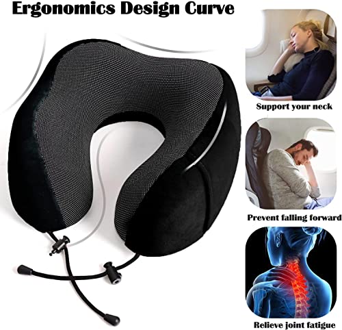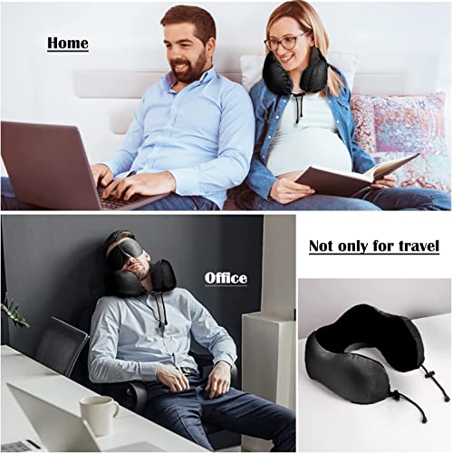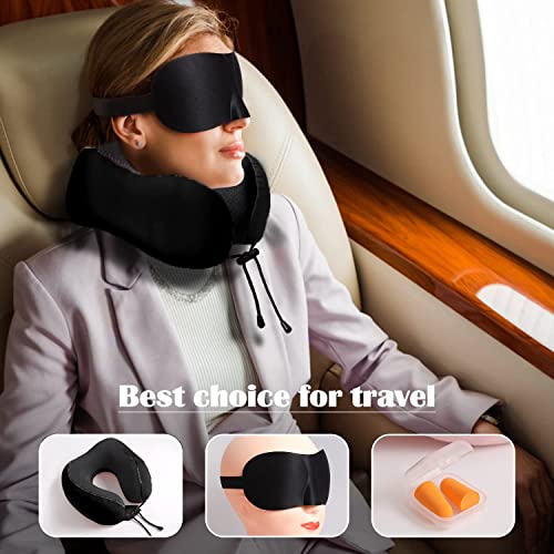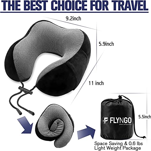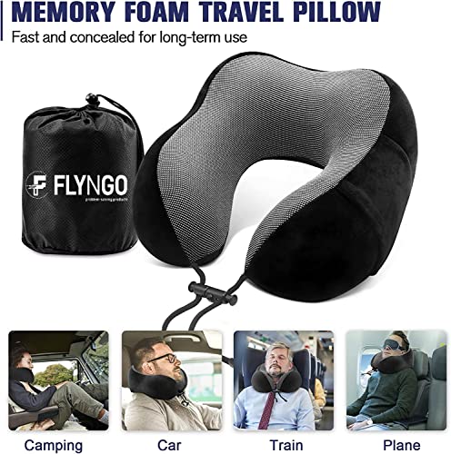 FLYNGO Memory Foam Neck Pillow for Travel Neck Support Pillow with Rest Eye Mask, Noise Isolating Ear Plugs Portable Combo (Black, pack of 1)