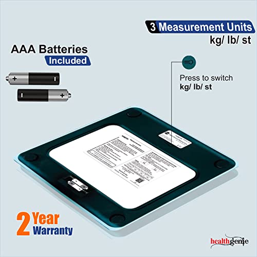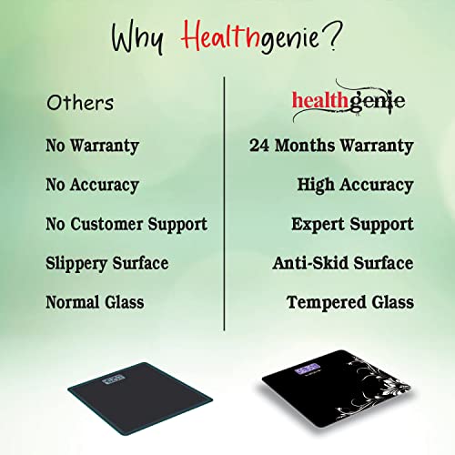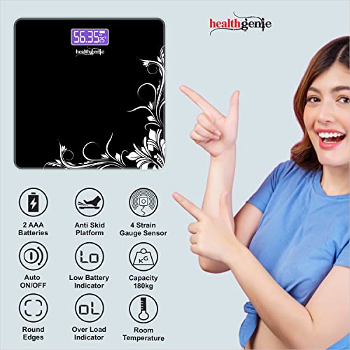 Healthgenie electronic digital weighing scale,personal weighing machine – (Black Pattern) can be used as digital bathroom scales. The design is fashionable black pattern and having anti-skid platform on jet toughened glass surface with curved edges for added safety.Reliable features of Healthgenie Weighing Scales are Large LCD display shows weight, room temperature and battery status,error, Low Battery indicator.5kg-180kg weight is the weight range,3 measuring units kg/lb./st (Press button at bottom to switch), Step-ON Technology, Error, Low Battery indicators & Auto Off are the some best features which makes it best scale.It have 2*AAA lithium polymer battery for greater life so no worry to charge it again.To calibrate the weighing scale place the weighing scale on hard, flat surface and initialize by pressing one foot on the platform until random numbers appear on screen,remove foot as it returns to zero (0.0),Now weight yourself.The best time to measure body weight is morning as weight tends to fluctuate throughout the day as per food and liquid intake.Weight variations : It is suggested to always ignore the first reading for calibration every time for best accuracy.