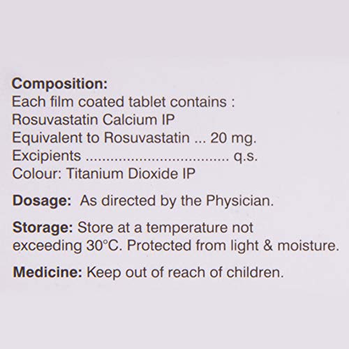 Composition: Each film-coated tablet contains : Rosuvastatin Calcium IP Equivalent to Rosuvastatin 20 mg. Excipients q.s. ; Colour: Titanium Dioxide IP