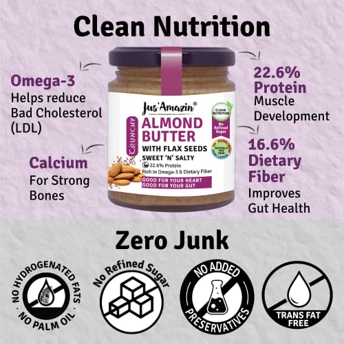 Jus’ Amazin Crunchy Almond Butter – with Crunchy Flaxseeds (200g) | 22% Protein | Plant-Based Nutrition | 86% Almonds | Rich in Omega-3 | Zero Chemicals | Vegan | Dairy Free | 100% Natural