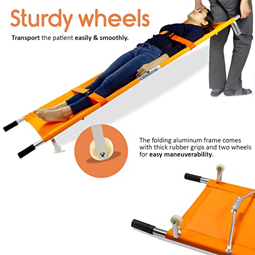 STURDY & SAFE: This folding stretcher is equipped with safety straps & oversized buckles for secure patient support. The folding aluminum frame comes with thick rubber grips and two wheels for easy maneuverability. It’s simple yet strong structure makes it a reliable option for taking care of patients.