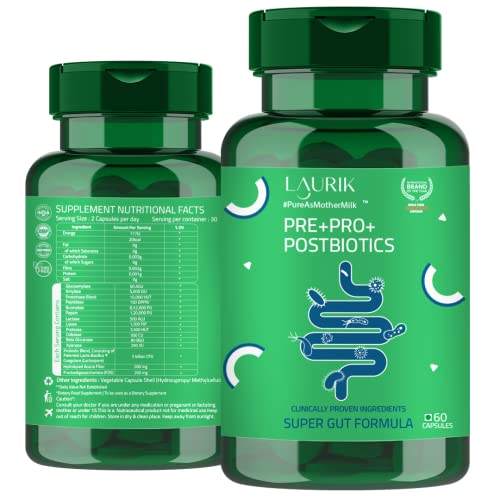 Laurik Prebiotic+Probiotic+Postbiotic One super gut formula for Low digestion, Immunity, Energy, Fatigue & healthy weight & body Naturally. Prebiotic+Probiotic+Postbiotic Dietary Supplement Capsules, Comprehensive intestinal Tract Support Immune System Support