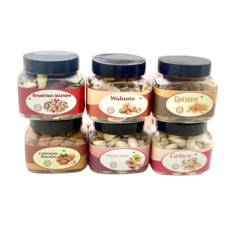 LIVWELL Fresh and Healthy Premium Raw Nuts Dry Fruits corporate Festive and wedding card gift box Combo Pack of 6 California Jumbo almond Breakfast mixture Walnuts Pistachio Raisin cashew Jar Pack (800gram )