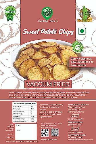 Vacuum fried Masala Sweet Potato Sweet potatoes are sweet, starchy root vegetables that are grown worldwide. Sweet potatoes are a great source of fiber, vitamins, and minerals. Shuddha Aahar/ Bakahu Vacuum fried organic Sweet Potato chips is never compromised with taste, quality & hygiene. Key point of Shuddha Aahar/ BaKahu vacuum fried Sweet Potato Chips: Potatoes are an excellent source of many vitamins and minerals. Potatoes are a good source of antioxidants, which may reduce heart disease, diabetes and certain cancers. Potatoes contain resistant starch, which may help reduce insulin resistance. In turn, this can help improve blood sugar control. The resistant starch in potatoes may also improve digestive health. potatoes are a great addition to your diet in moderation. 100% vegetable snacks, Gluten-free and Vegan. 90% less oil than regular chips & High nutrient product. No MSG added, no artificial flavours, colours or preservatives Retains the natural colour, nutrients & fiber content of the raw sweet potato.