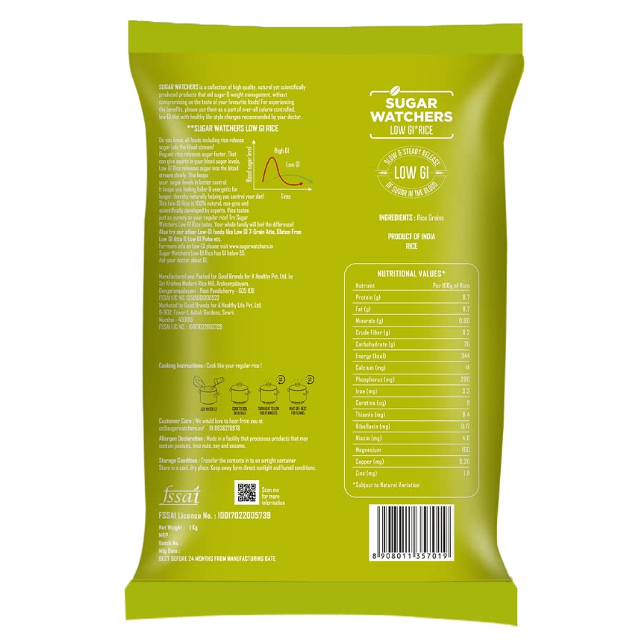 Sugar Watchers Low GI Rice | Diabetic Friendly White Rice | US FDA Registered | Good for Weight Loss | Clinically Certified Low GI | Patented Technology | 100% Natural & Pesticide Free | Dietician Recommended | 1Kg