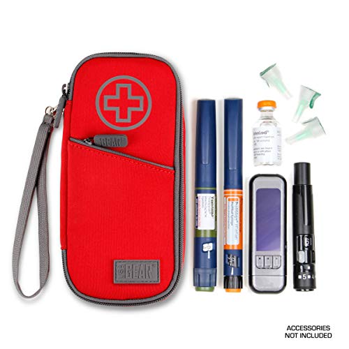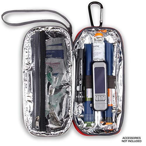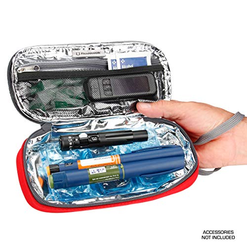 The USA GEAR FlexARMOR Medical Case is ideal for holding personal medical supplies, such as a glucagon emergency kit for low blood sugar, insulin pens, insulin syringes, glucose gel packs, small ice packs, and other medicine essentials. The highly visible red color on the insulin case is easy to identify when time is of the essence. The soft neoprene exterior of the diabetic case repels moisture, and the silver thermo-lined interior insulates the inside of the case.