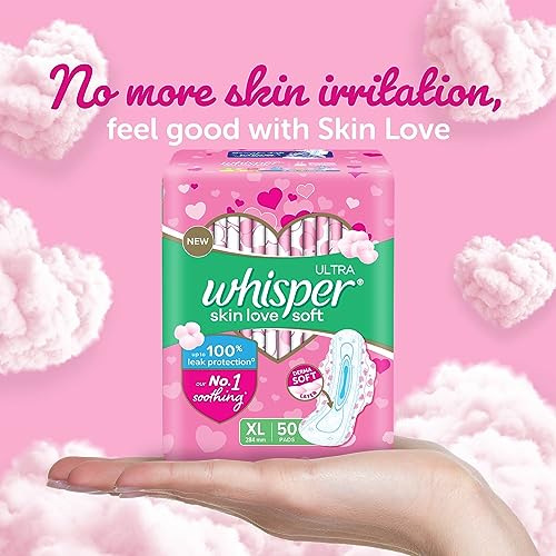 Whisper Ultra Skinlove Soft Sanitary Pads for Women|50 thin Pads|XL|Cottony soft|our #1 Softness|Soft top sheet|Irritation free |28.4 cm Long|With disposable wrap