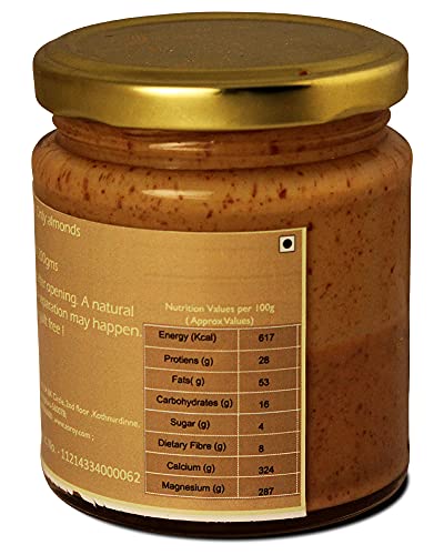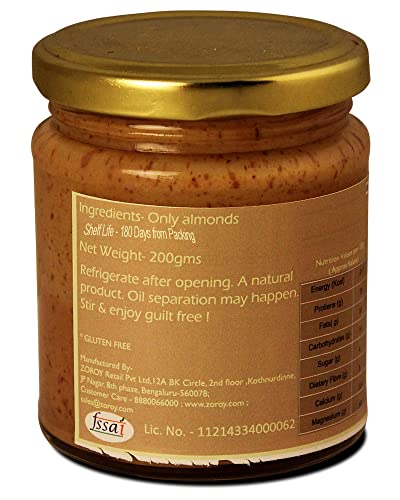 ZOROY THE FINESSE , 100% Pure, Natural, Unsweetened Almond butter is a craft product made in small batches. The almonds are first slow roasted to perfection into golden brown colour to bring out their nutty flavour. They are then stone grinded with absolutely nothing to give you this creamy smooth almond butter. No preservatives or any kind of emulsifier is added to the product. We do not add any kind of sugar to this product. The goodness of almonds is maintained in each bite. Since there are no emulsifiers present in the product, please stir the bottle before each use to mix in the oils that might have separated naturally. The product is completely dairy free, suitable for Keto diet, compleytely gluten free, rich in minerals and fiber, rich in Vitamin E. Add 4 tbsp of almond butter to 4 cups water along with a few dates for natural sweetness and your perfect Almond Milk is ready ! Pour the “milk” into an airtight storage container and keep it in the fridge for up to 4 days. Use it over cereal, granola, chia pudding, or in smoothies. Commercially available nut milks remove the fiber from their nut milk, when you make your milk using our nut butter you will be nourishing yourself with the goodness of a Whole-Nut.